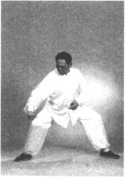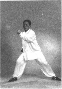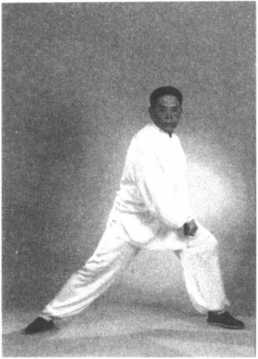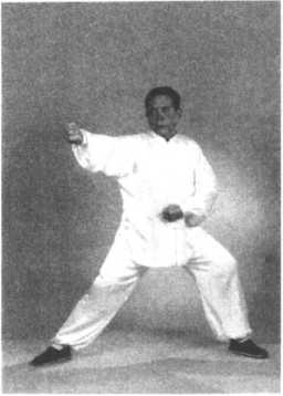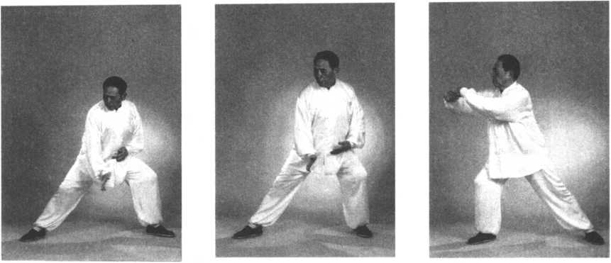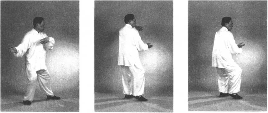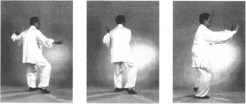 ②转身上步时,两手领住周身之气自右向左转圈。转体、转圈、重心左移与右脚上 步须同时完成。一气呵成,一转全转,一到全到。