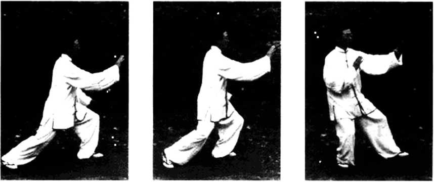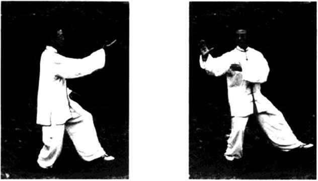 身体向右转,重心在右腿,左脚提起向前迈步,脚跟先落地;同时右掌下 落向右后上方划弧于右肩外,掌心向外,掌指向上;左掌由下向上经面前划 弧于右肩前,掌心转动向内,掌指向后;眼视右手方向(图20.2)。