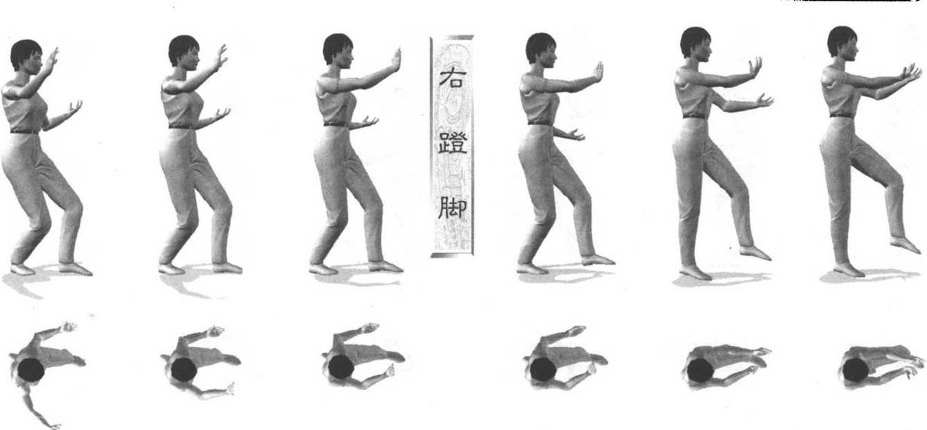 1 .右脚跟进半步,身体重心移至右腿上。右勾手变成掌,两手心翻转向上,两肘微屈,同时身体微向右 转,左脚跟渐渐离地,成左虚步。眼看左手。2 .上体微微左转,右掌经耳旁向前推出,手心向前,手指与眼同高;左手收至左侧腰前,手心向上,同时 左脚微向前移,脚尖点地。眼看右手。