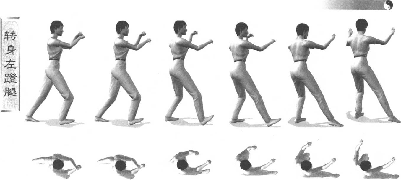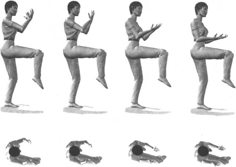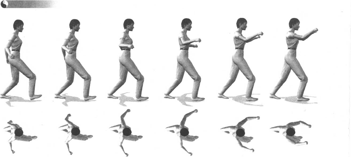 1.右腿收回,膝盖提起,左手由后向上、向 两侧,手心均向上。前下落,右手也翻转向上,两手同时向下划弧分落于右膝盖2.右脚向右前方落下变成右弓步,同时两手下垂,慢慢变拳3.两拳分别从两侧向上、向前划弧至脸前成钳状,拳眼都斜向后(两拳中间距离约10?20厘米)。眼看 右拳。