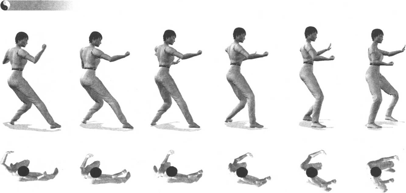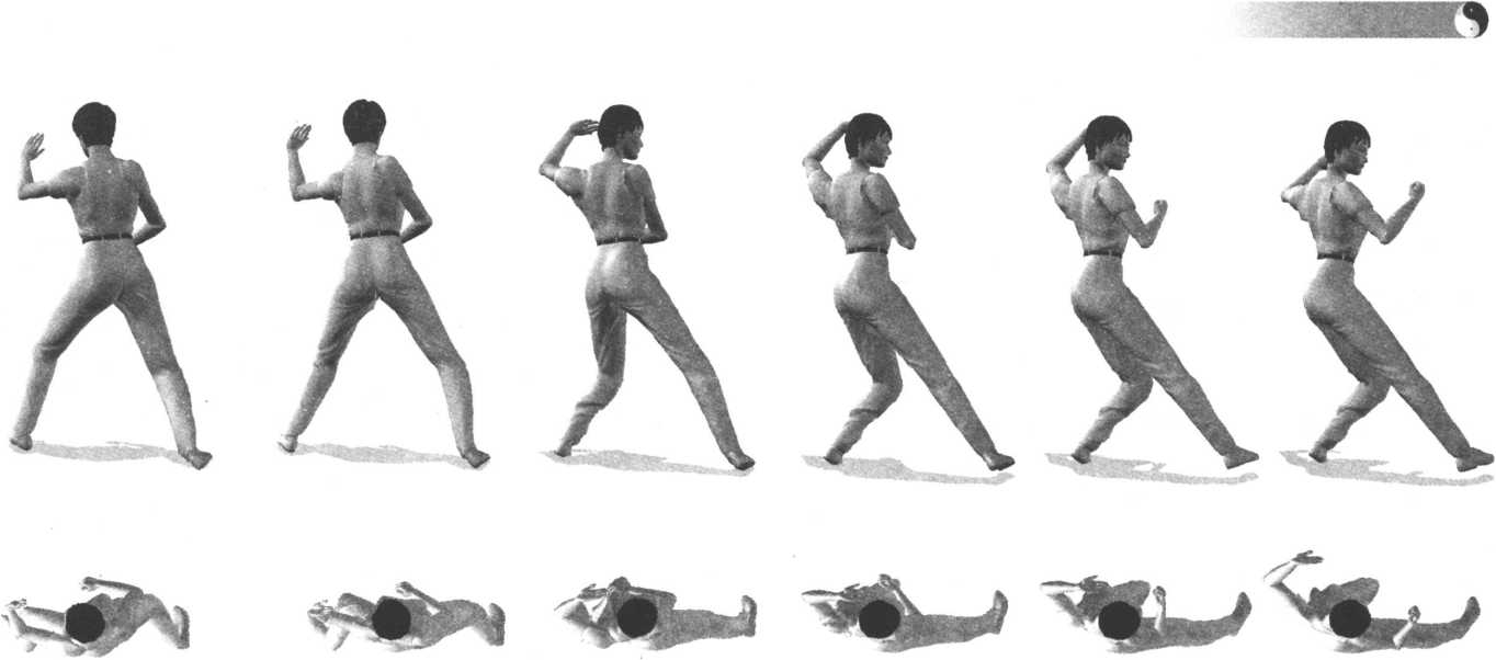 2 .然后重心再移至左腿上。右手随着转体而向右、向下(变拳)经腹前划弧至左肘旁,拳心向下;左掌上 举于头前方,掌心斜向上。眼看前方。