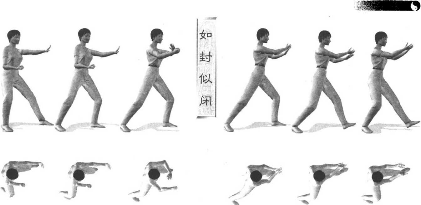 1 .上体后坐,重心移至右腿上,左脚尖往里扣,身体向后右转。右臂平屈于头上方,拇指朝下;左手上起 向前平推,高与鼻尖平,手心向前。眼看左手。