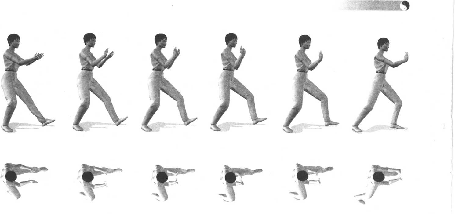 1 ,左手由右手腕下向前伸出,右拳变掌,两手心向上慢慢回收,同时身体后坐,左脚尖跷起。2 .重心再移至右腿上。眼看前方。3 .两手在胸前翻掌,向前推出,腕与肩平,手心向前,同时左腿前弓变左弓步。眼看前方。