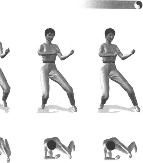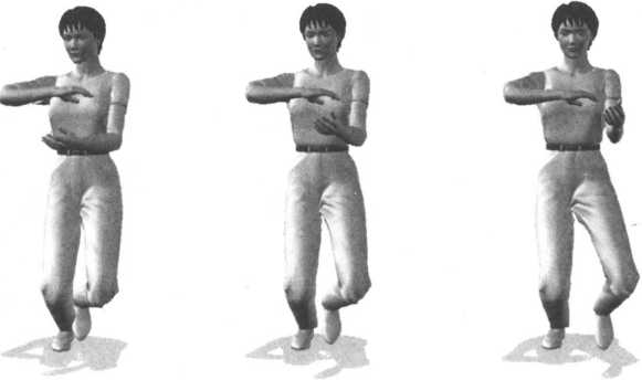 1 .身体微向右转,重心移至右腿上。同时右手收在胸前平屈,手心向下;左手经体前向下划弧放在右手 下,手心向上,两手相对成抱球状。左腿随之收到右脚内侧,脚尖点地,眼看右手。