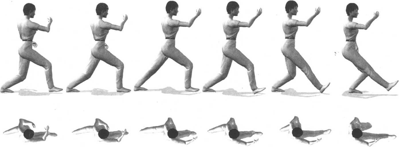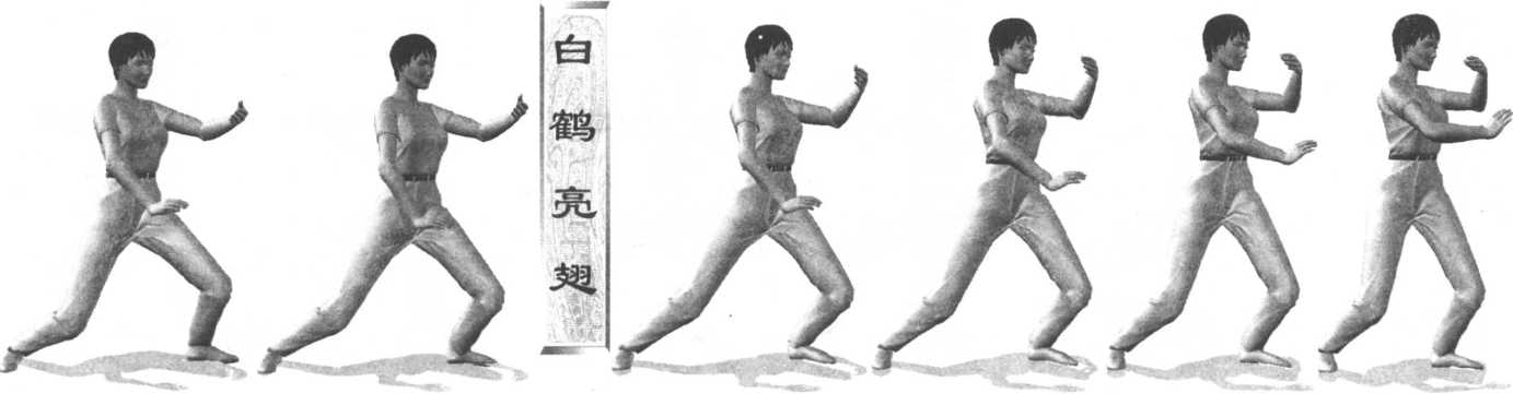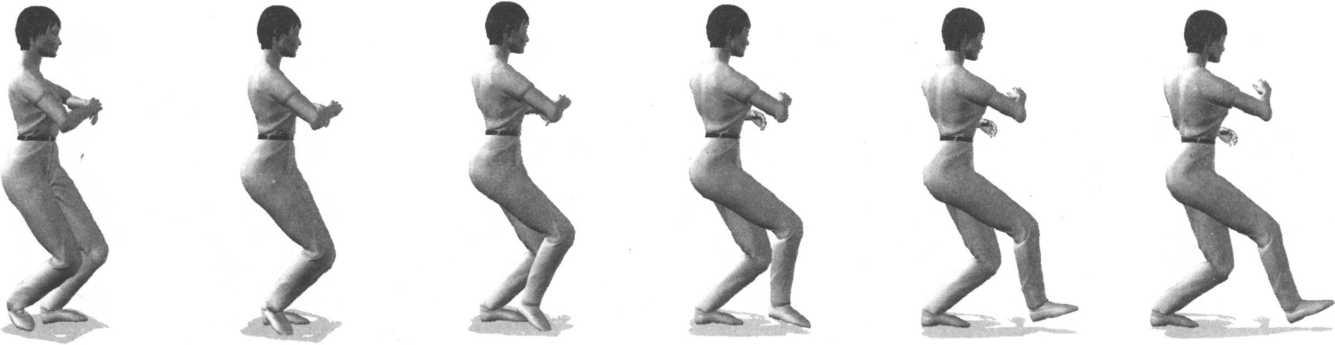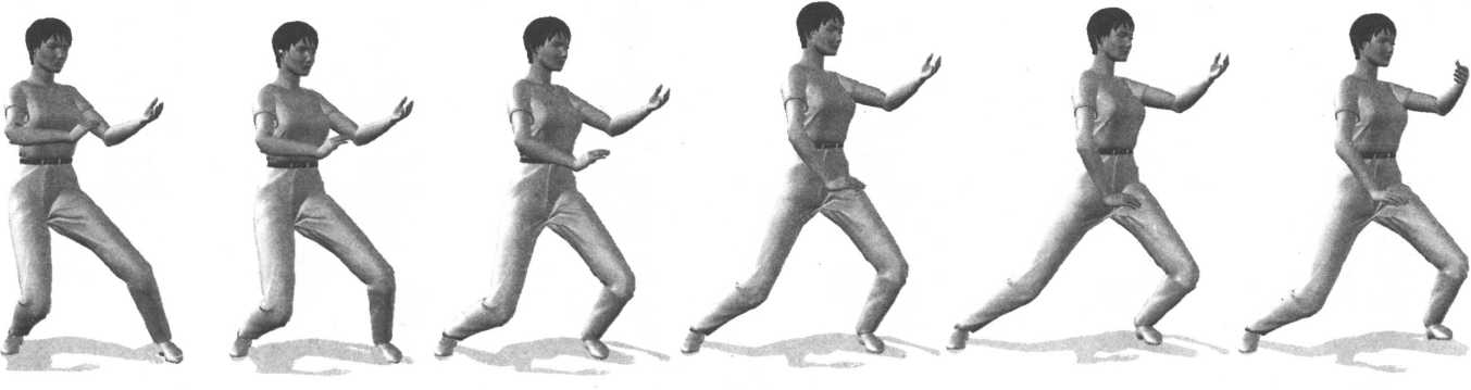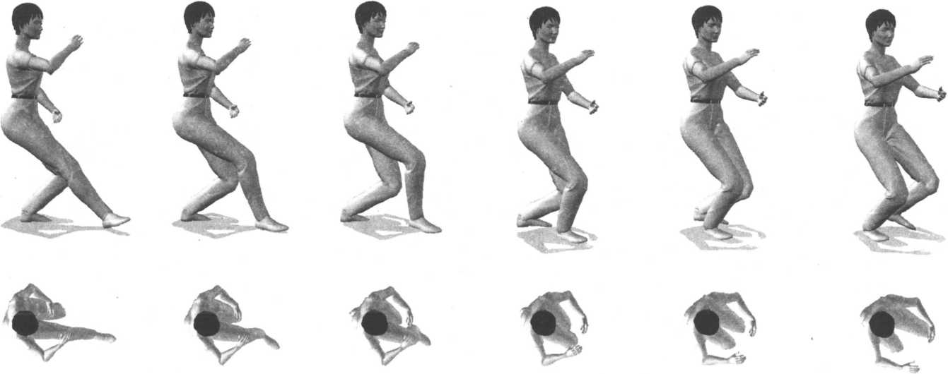 4 .上体慢慢后坐,重心移至右腿上,左脚尖跷起微向外撇,随即左腿慢慢前弓。