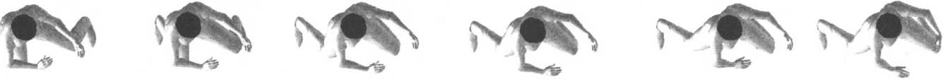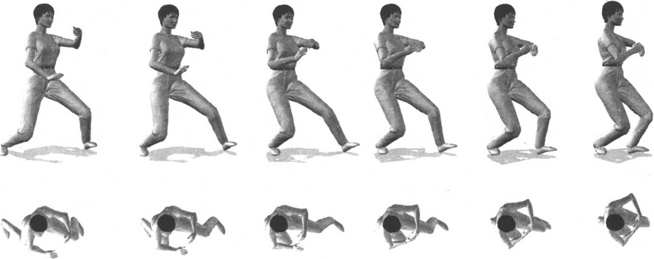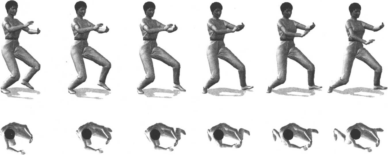 8 .右腿慢慢前弓,身体右转,重心再移至右腿上。同时右手翻转向下,左手向右上划弧放在右手下,两 手心相对成抱球状;左脚随之收到右脚内侧,脚尖点地。眼看右手。