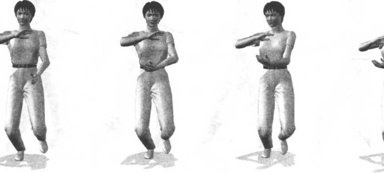 6 ,上体微向左转,右臂屈肘收回,右手附于左手腕里侧(相距约5厘米)。