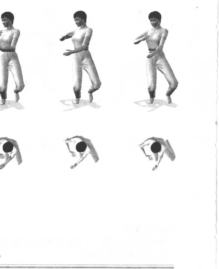 1 .身体慢慢向右转。左手自然下落经腹前划弧至右肋前,手心向上;右臂屈肘,手心转向下,收至右胸 前,两手相对成抱球状。