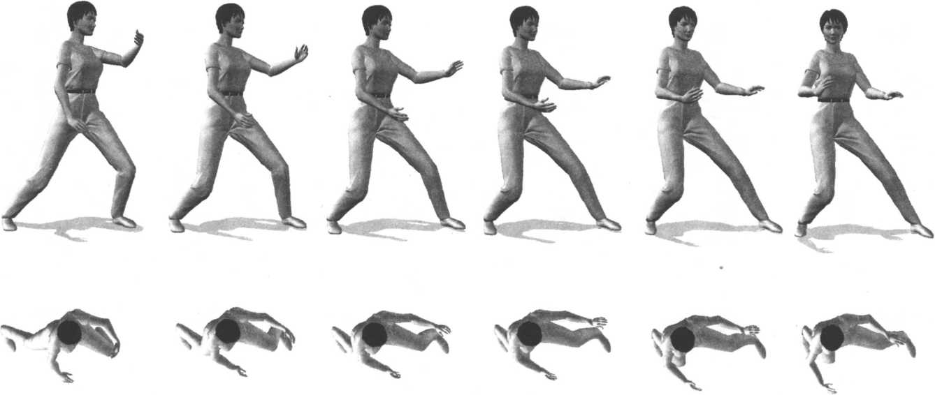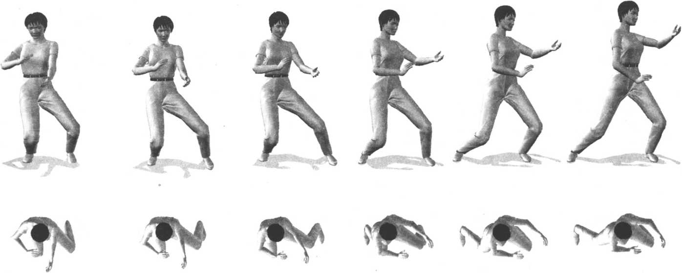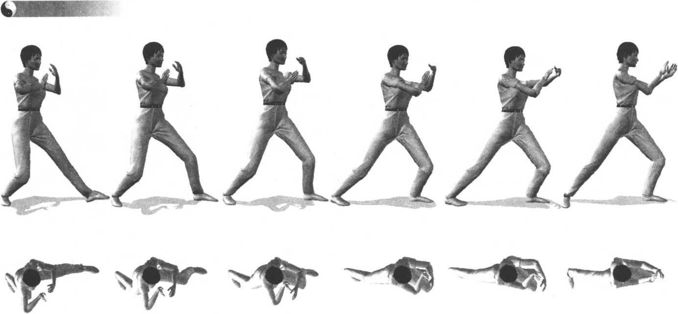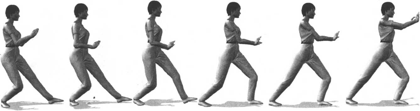 9.两手向前、向上按出,手腕部高与肩平,同时左腿前弓成弓步。眼平看前方。