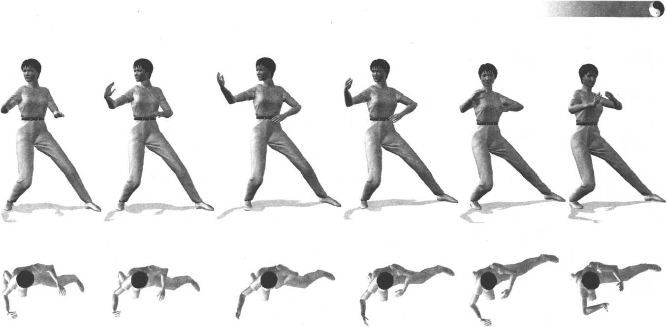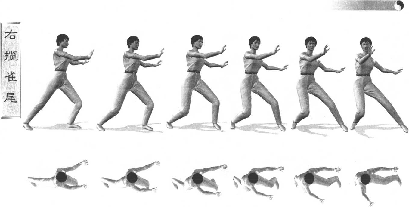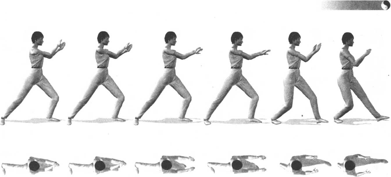 7 .双手同时向前慢慢挤出,左手心向后,右手心向前,左前臂要保持半圆;同时身体重心前移变成左弓 步。眼看左手腕部。