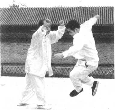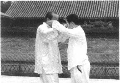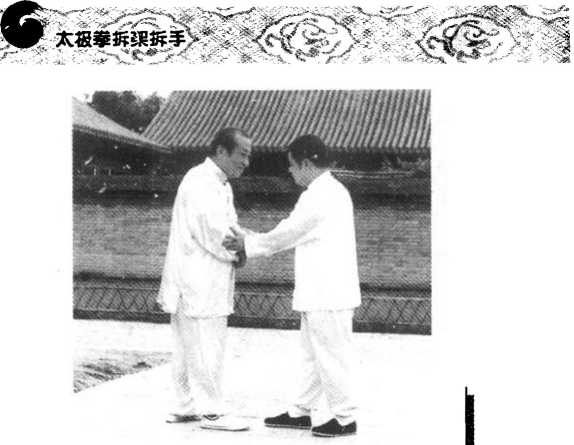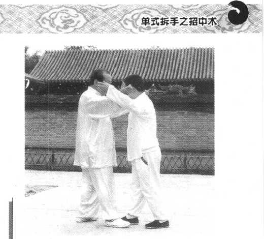 1 .当我起腿时,对方双手下落 欲抱我膝;我立即内气下沉,两手向 右膝两侧踏采,化开对方之手后,立 即依斜圆向前上方划弧搠到对方两 肩头。(图61、62)国622 .双手边内旋边握拳,内劲由 劲源向两拳贯注,照准对方双耳发 去,此刻对方会出自本能地出劲下按 我之两臂,我则由两拳中指根通出搠 挤内劲,将对方发出。(图63、64)困64ffl 65