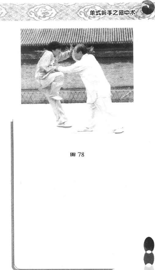 3.递出两前臂,引对方出双手 拦截,此谓之“递肘腾手”(图75)。随后两前臂蕴含太极枪中“凤凰点头” 的劈崩劲法,相继运用采、捌内劲控 制和调动对方,最后双手沿逆时针轨国77迹翻转,右手后引、左手向前穿伸而 将对方发出。(图76 ~ 78)BH 79