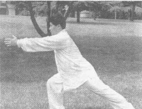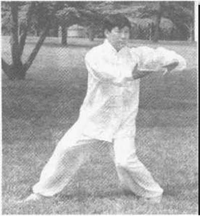 (3) 接上动作,胯微向左转。右手向前舒松,左手顺右小 臂撤至右肘,似着非着,两大指均向上。重心不变,右足主务, 左足吸力。头正,身直,目正视(图16)。