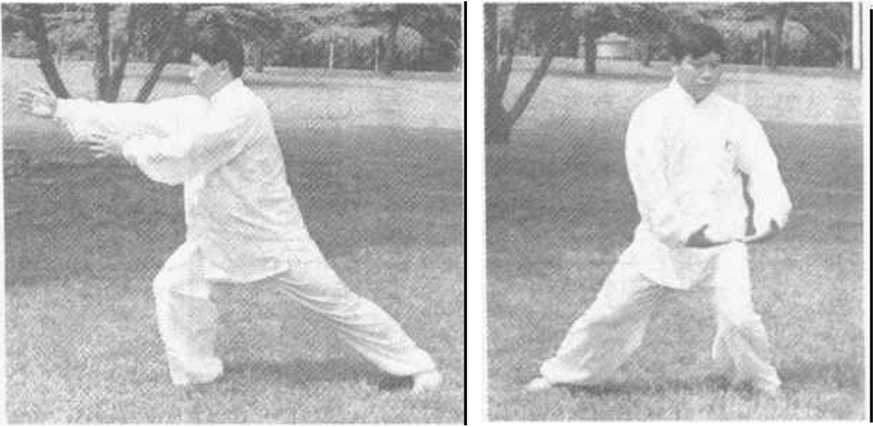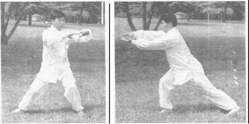 与胸平。重心不变,左足主力,右足吸力。头正,身直,目视两