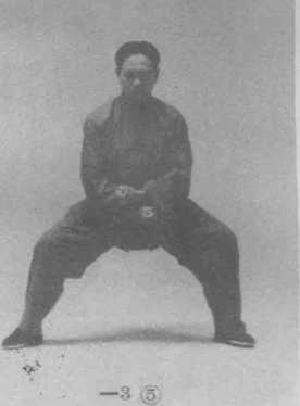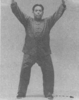 习此功是通过两臂有节律地开合、胸腹间沉稳徐缓地 折叠与伸展,达到培补元气、增长内劲的目的。具体练法 是:由无极式始,两腿微向下蹲,两臂屈肘缓缓向胸前抬 起,手心朝上(图一 3①),两前臂渐渐内旋,两手向两侧 斜上方撑展开去(图一 3②)。撑展时注意肩、肘、腕各关 节仍要保持自然松弛状态,不要有一处呈现僵硬挺直状。 左腿向左横开半步,两腿下蹲,同时两臂向两侧徐徐下 落,内气随之缓缓下沉(图一 3③)。两掌渐渐屈指握拳,