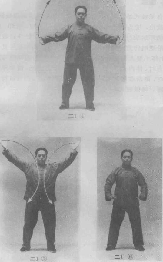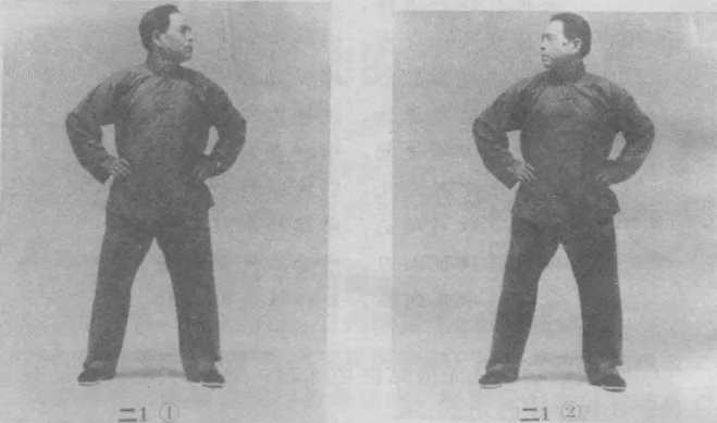自无极式始,两手叉腰,头部平向左右转动,速度要 和缓均匀,头、肩皆保持平直,身体舒松自然(图二1① ②)。练习数次后接做收式。