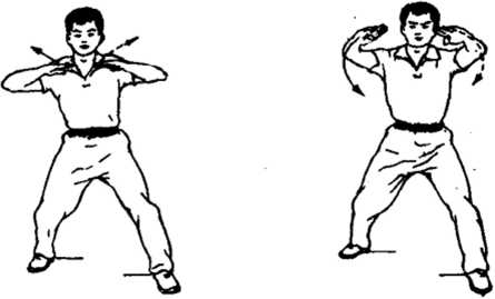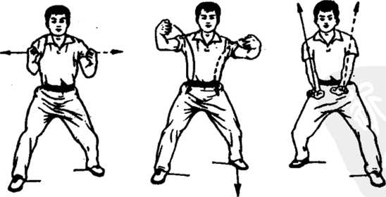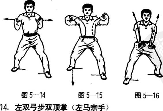 两拳变虎掌,两臂外张弧屈,两掌背朝外顶击。两掌高与肩 平.掌心相对。眼看前方。(图5-15)