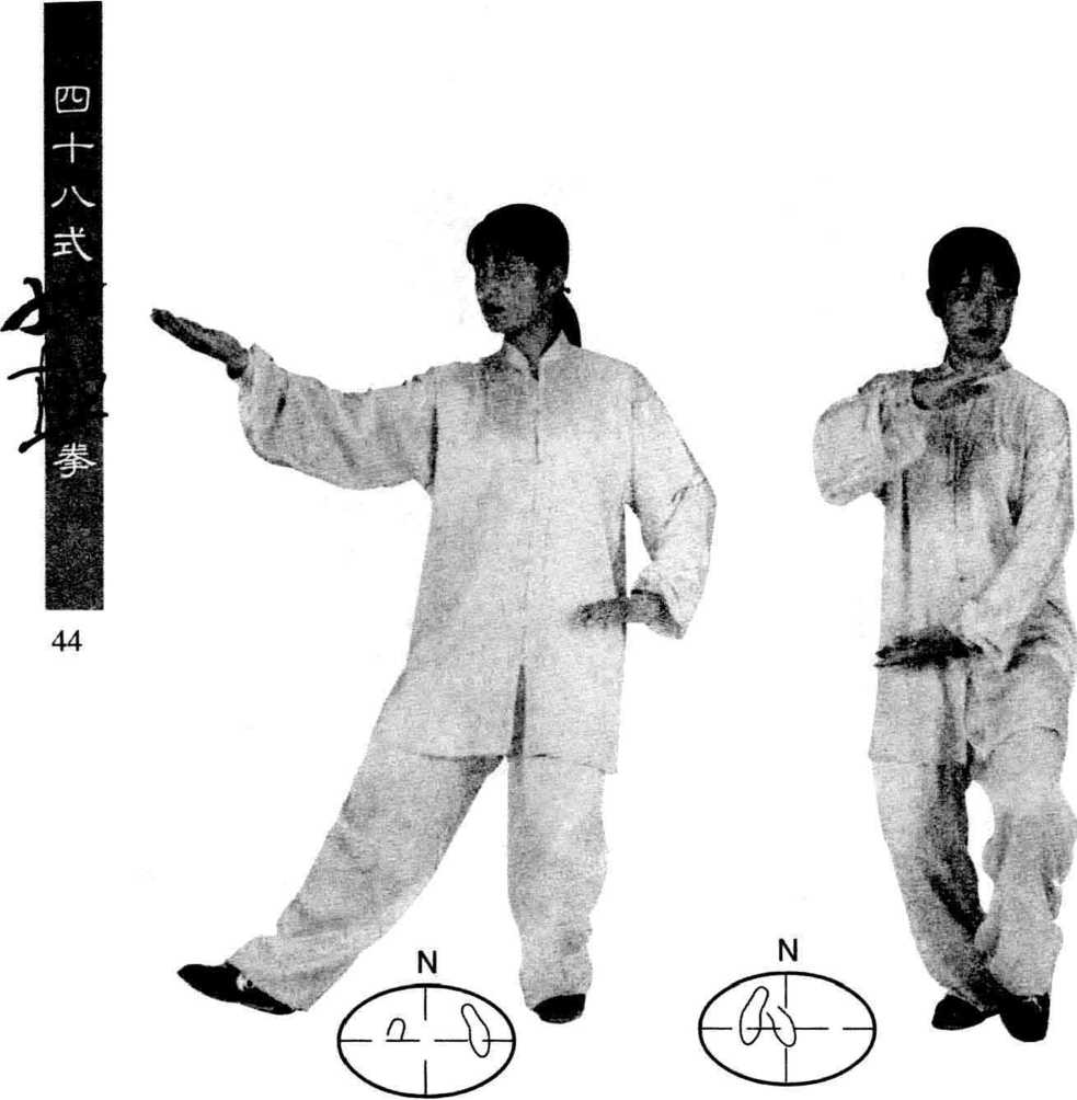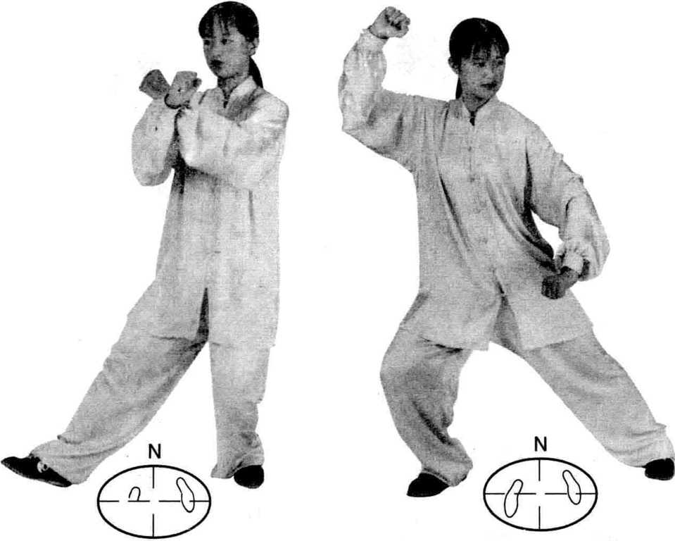 上体微右转,右脚向右前 方(正西偏北约30度)迈出,脚 跟着地同时两手握拳,前臂 微内旋。眼看前方。