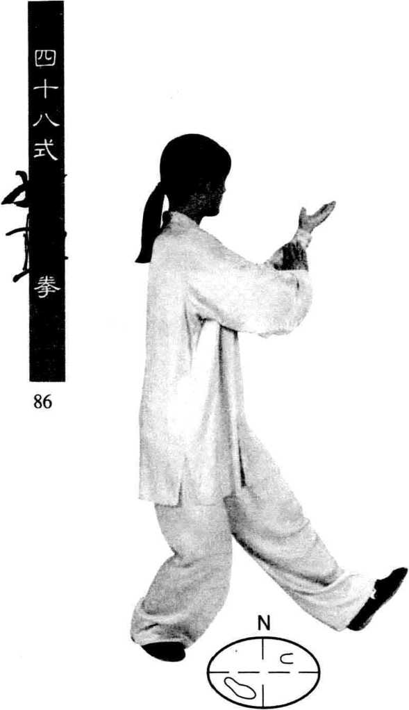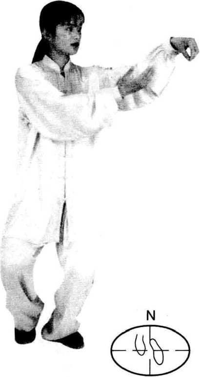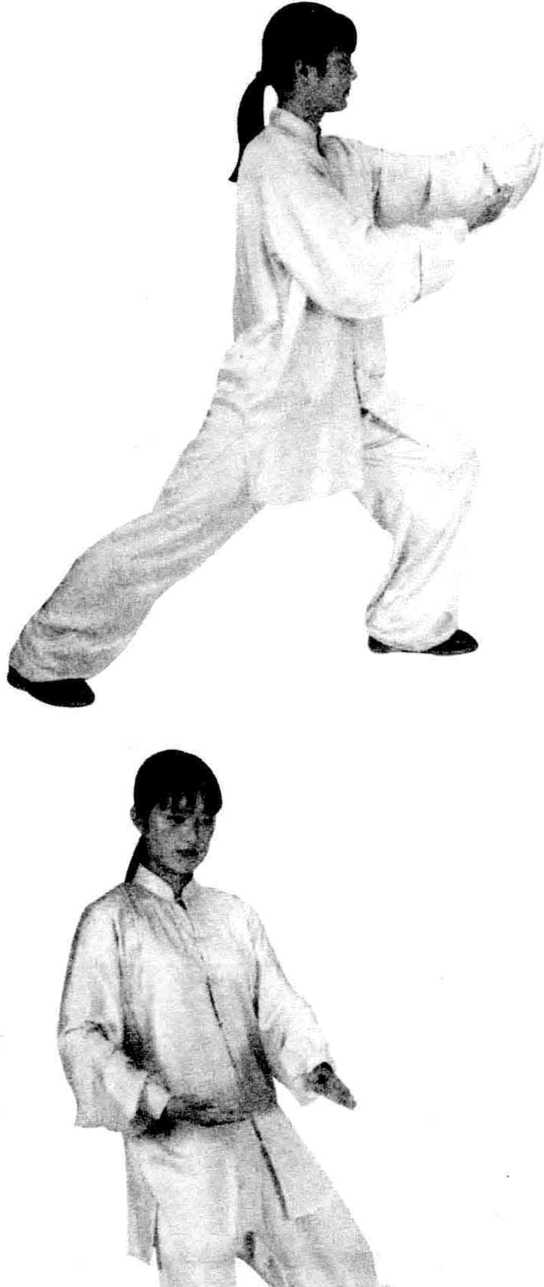 重心前移,左腿屈膝前 弓,上体左转;左掌自右向 前划平圆,高与肩平,掌心 斜向内,右掌掌指附于左腕 内侧随之划圆。眼随左掌。