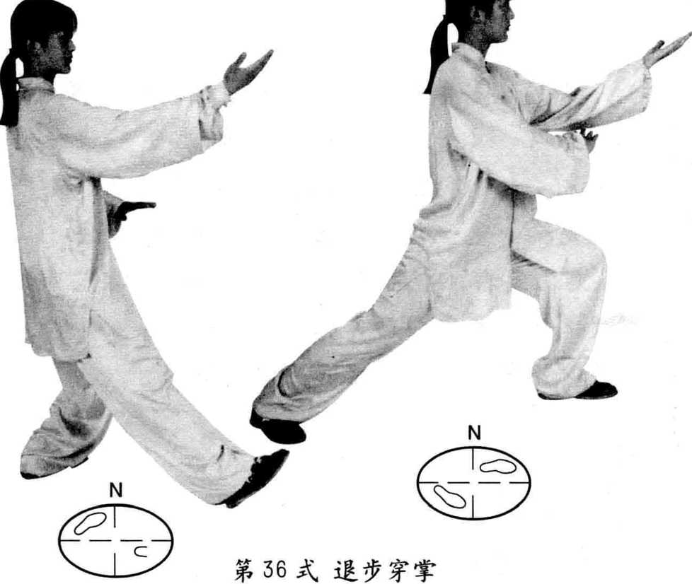 ,右脚尖 翘起,上体左转;左掌向左、 向后划弧至左腰侧,掌心向四、后坐落掌重心后移至左腿,右脚尖 翘起,上体左转;左掌向左、 向后划弧至左腰侧,掌心向(2)撤步穿掌右脚提起经左脚内侧向后 (正西)撤步,左腿屈膝成左弓 步右掌下按,落于左肘下方(2)撤步穿掌右脚提起经左脚内侧向后 (正西)撤步,左腿屈膝成左弓 步右掌下按,落于左肘下方下;右前臂向外旋,右掌落于下;右前臂向外旋,右掌落于左掌掌心翻转向上卷收至腰左掌掌心翻转向上卷收至腰体前,掌心斜向左上。眼看右体前,掌心斜向左上。眼看右间,再经右前臂上向前上方穿间,再经右前臂上向前上方穿|