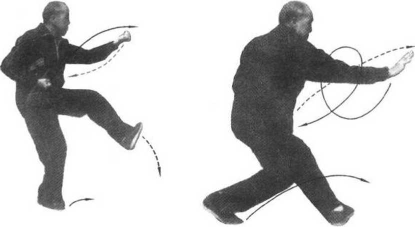 打劈拳时之上攒一样;同时,左腿提起,左脚尖向回勾,左脚极