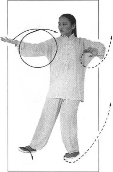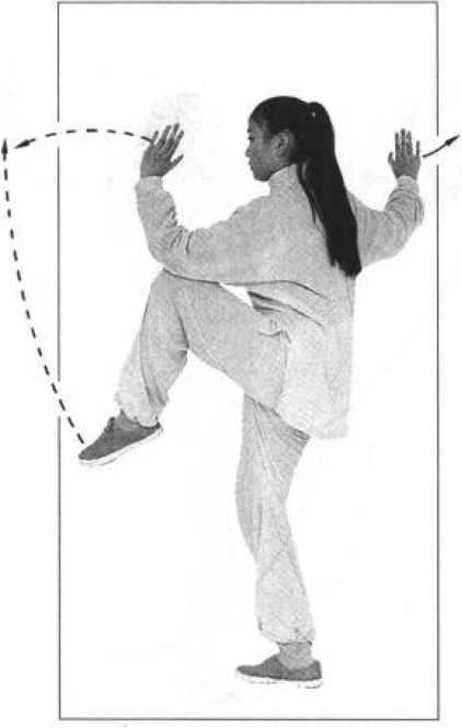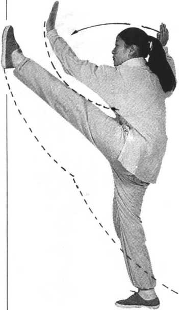 同时,右手向前拍击 脚面,左手向后、向上划弧至身体左后上方,手心向外,腕高 与头平;眼看右手(图68)。⑶右脚下落至左脚内侧,重心移至右腿独立站稳(膝微 屈),左膝上提,小腿与脚尖自然下垂;同时,右手向下、向 后、向上划孤至右肩上方,左手向前划弧至左膝上方(肘、膝 相接或成垂线);眼向前平视(图69)。⑷左脚上踢,左手向前拍击脚面;其他动作与技术要求 参照右拍脚(图70)。