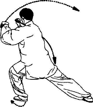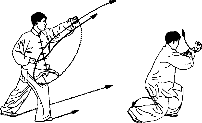 右掌变拳,向左摆动,随之屈肘收 抱于右腰侧,拳心向上,左掌顺右 臂下向前、向上、向左刁采变勾手