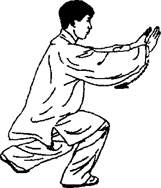 ②身体微右转再微左转,右脚向右侧开步成右横裆步;同时 右拳向上、向左前方移动,用右前臂向左前方用力推搓撅肘,右