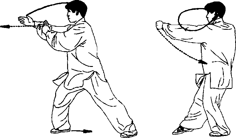 ② 身体右转,重心右移,右脚跟踏实,随之左脚经右腿后向右