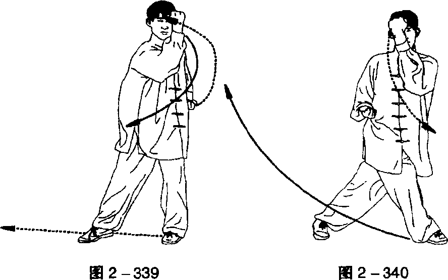 ① 下肢步型不变,身体左转;同时左拳屈肘收抱于左腰侧, 拳心向上;右前臂外旋,随转体向左格肘,右拳心向后,高与头 平。目视右前臂(图2-339)。