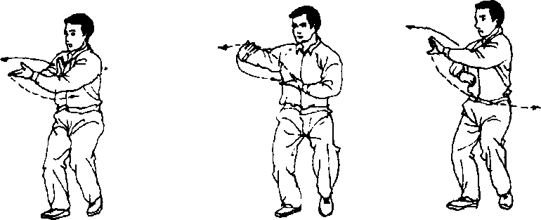 ① 三换掌这一势,两掌交替伸出收回时动作要圆活,腰胯 微右转时左掌伸出,腰胯微左转时右掌伸出,腰胯旋转两个来 回,左掌前伸两次,右掌前伸一次,故称三换掌。