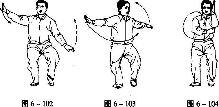 在合的过程中,左臂由逆缠转为顺缠,随缠随将左小臂竖起, 掌心旋缠为朝右;右掌变拳顺缠自右向前屈肘向左合劲,经左 臂下方划一个小圈后,置于左肘下方,拳心朝里。(图6-102 -104)