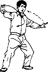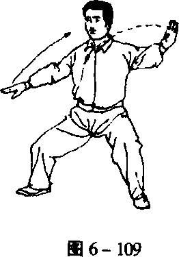 经胸前而下。右脚提起,经左踝旁向右后(西南)斜方以弧形 撤步,重心随着后移,右腿变实。同时,左掌逆缠向前推出; 右掌在胸前经前伸的左小臂下侧交叉而过,即由右下方随右脚 后撤时向右后弧形展开。(图6 - 108、6-109)