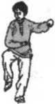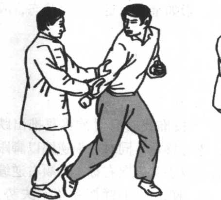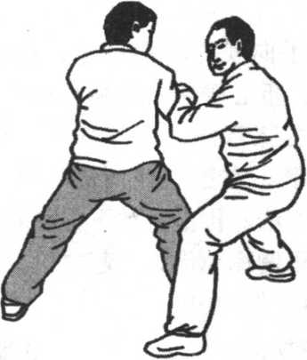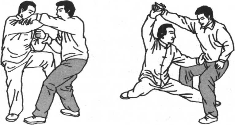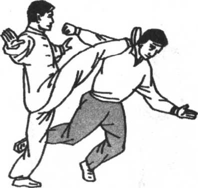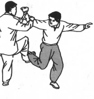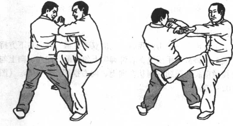 敌之下阴及腹部;或用右脚里侧向敌右膝下胫骨铲蹬击去,或 用双手振采之势将敌摔出。这是里合腿摔法。②右腿逆缠里转 提膝击其中盘,同时我双臂手以左逆右顺缠向左上方,将敌右 臂压住,向敌下须或胸部击去,配合左腿套住,这是向前摔击 法。③我右腿由敌右腿外后下方向右上外摆击敌腰胯或右腿弯 处,双手向左旋横击,将敌击伤摔倒。(图5-98. 5-99)