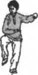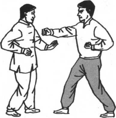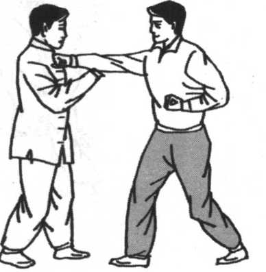 设敌进右步从我前方用右拳向我胸部击来,欲将我胸部击 伤。我即乘势身向右略转以避敌右拳击我胸部之势。同时我左 腿逆缠提起,向敌右腿外侧进步以备变化虚实击敌。同时我双 手以左逆变顺?缠,由身前向敌右臂外侧棚振敌肘、腕部,准备 顺势将敌振出摔倒。如我左腿蹬击敌下盘,双手撮发敌上肢, 也是一种摔法。(图5-97)
