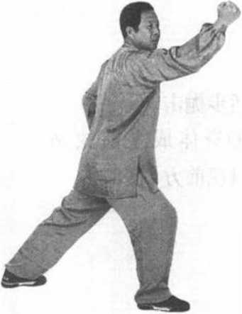③ 图84右脚向前迈一步 落地,腿即屈膝,左腿 伸直。随右脚前上步,