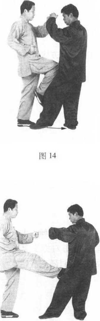 ②我左脚向前迈半 步,同时右腿屈膝,用 膝尖向上、向前顶击对 方小腹部位。目视对方 (图 14)。