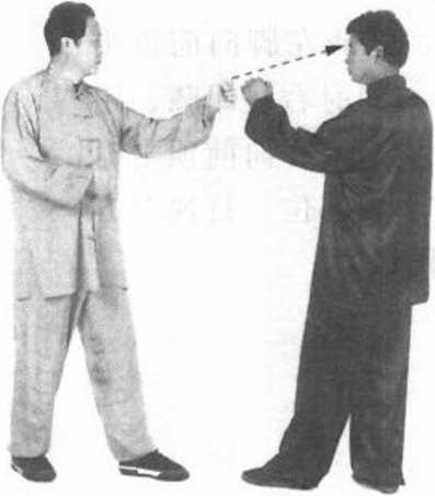 ③ 对方头部向左或 向右躲闪,或用左拳格 挡。我右拳紧跟着向前 直击对方胸部(膻中穴)。 拳眼朝上。目视对方(图 18)。