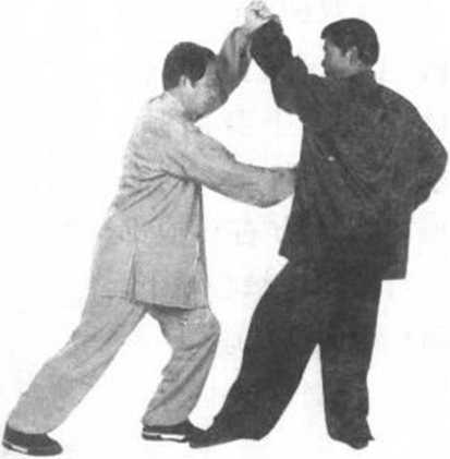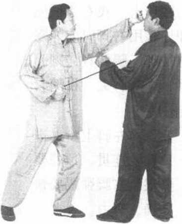 ③ 对方左脚后退躲闪 我右膝顶击。我右膝顶撞 后即伸膝用右脚向前弹踢 对方裆部,腿伸直,脚面 绷平,力达脚尖。目随右 脚(图15)。