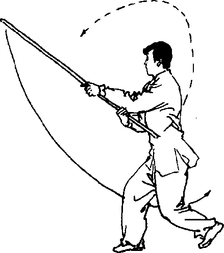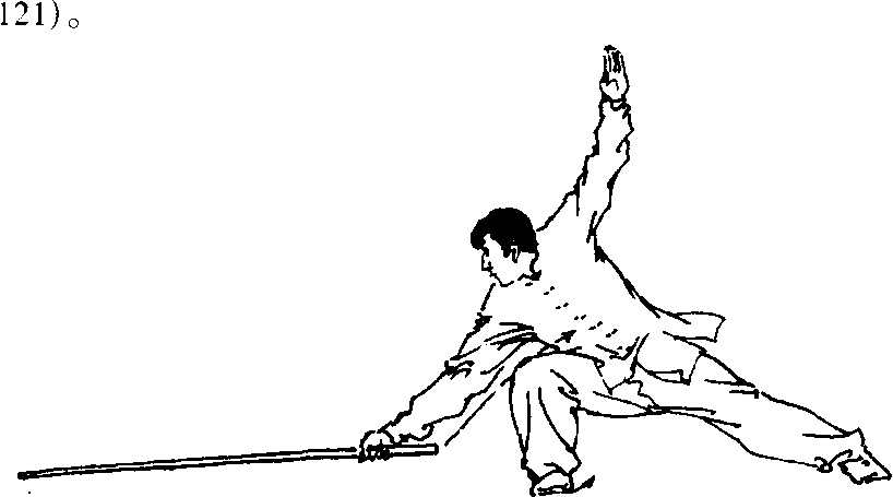 上动不停c向左转身 成左弓步,亦可向前行 步;棍拖在身后(图5- 120) o