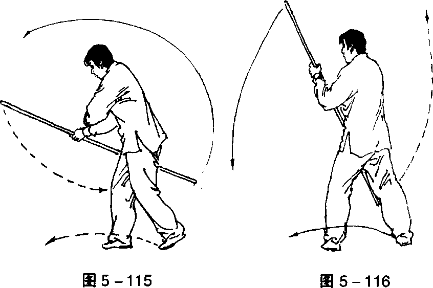 ②左脚上步,脚尖内扣, 上体稍右转;同时左手向上, 右手向下拨棍,使棍斜立于 体前。目视左前方(图5 - 116)o