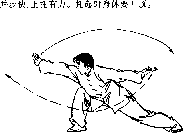 左腿蹬地,左脚向右脚并拢,前脚掌着地;身体直立,带动两 掌经胯侧向前、向上托起,至头上方,掌心朝后上方。目视上方 (图 3 -254)。