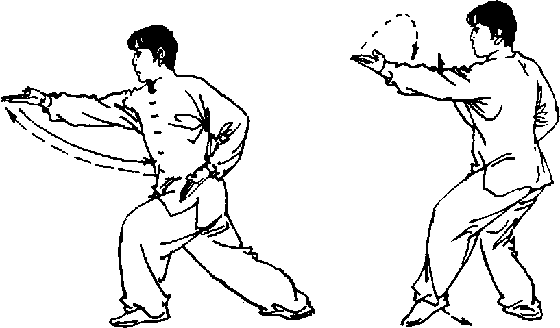 ②右掌向前、向左砍掌;左掌随之外旋,稍屈肘,接握右前
