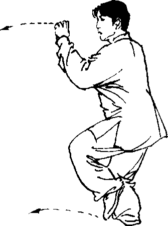④重心下降,右腿半蹲,左脚回收成丁字步;左掌屈臂回挂;