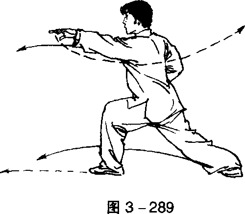 左脚上步成左 弓步;左掌直臂向前 插掌;右掌收抱腰 间。目视左手(图3 - 289) o