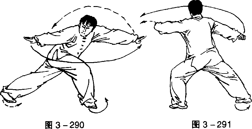 ①上动不停。以两脚掌为轴,向左转体180。;两臂随之平转, 掌心均朝下。目视前方(图3-291)。