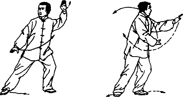 3 .左脚外摆;右脚里扣,左腿屈膝,重心后移,上体随 之左转(胸向南)成左横弓步;随转体左手向上,经面前向左 划弧举至左肩前上方,腕略高于肩;右手经体前向下划弧落于