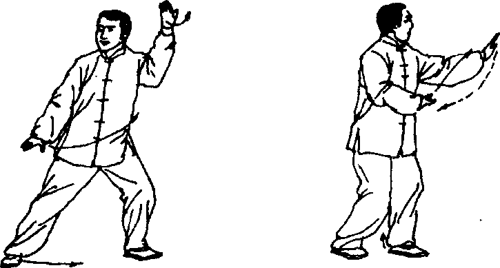 4 .右脚尖稍外摆踏实,重心右移;左脚向左开步,脚跟 着地;同时上体右转(胸向西南),随转体右手向上经面前向 右划弧举至右肩前,腕略高于肩;左手向下划弧经腹前至右肋 前;眼看右手。