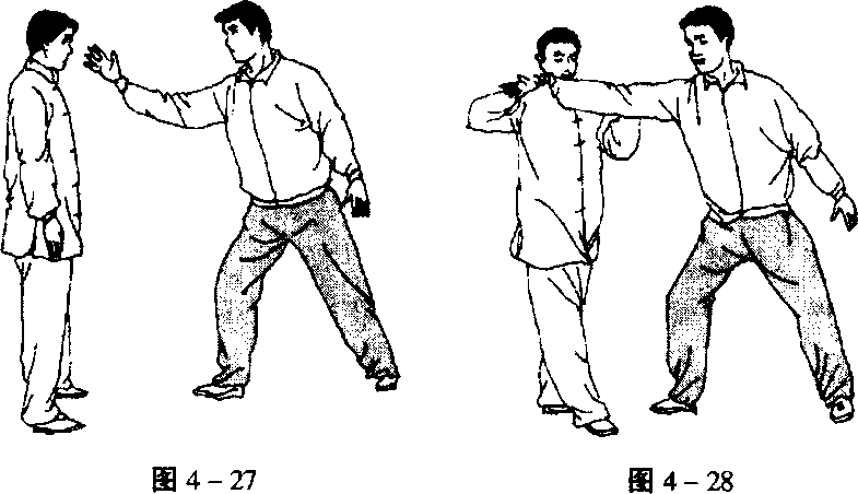 第四章吴式太极拳竞赛套路的防身用法如对方以右掌向我面部打来,我则以右手力其右腕,随之 向右微微侧身,进左步锁其后足,蹲成马步,同时以左臂从敌 之右臂(遇身高者走下边,短者走上边)穿过,复以左掌臂抽 其面部。(图 4-27、4-28. 4-29. 4-30)