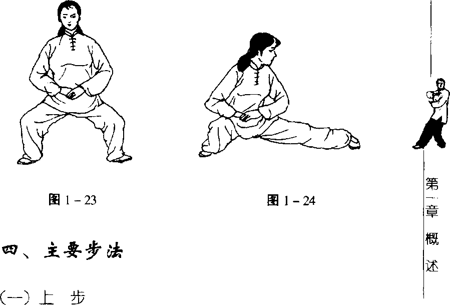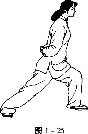 一腿支撑,另一腿提起经支撑腿内侧向前上步,脚跟先着 地,随着重心前移,全脚掌着地。(图1-25、1 - 26)